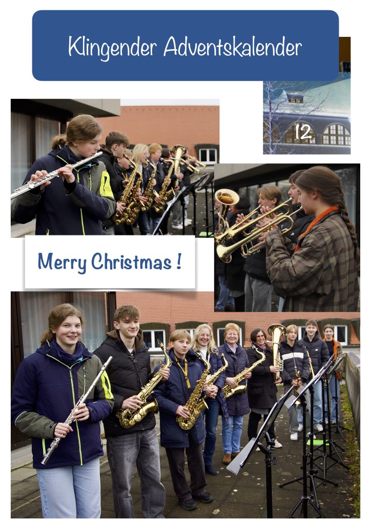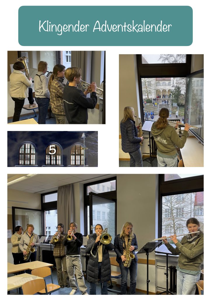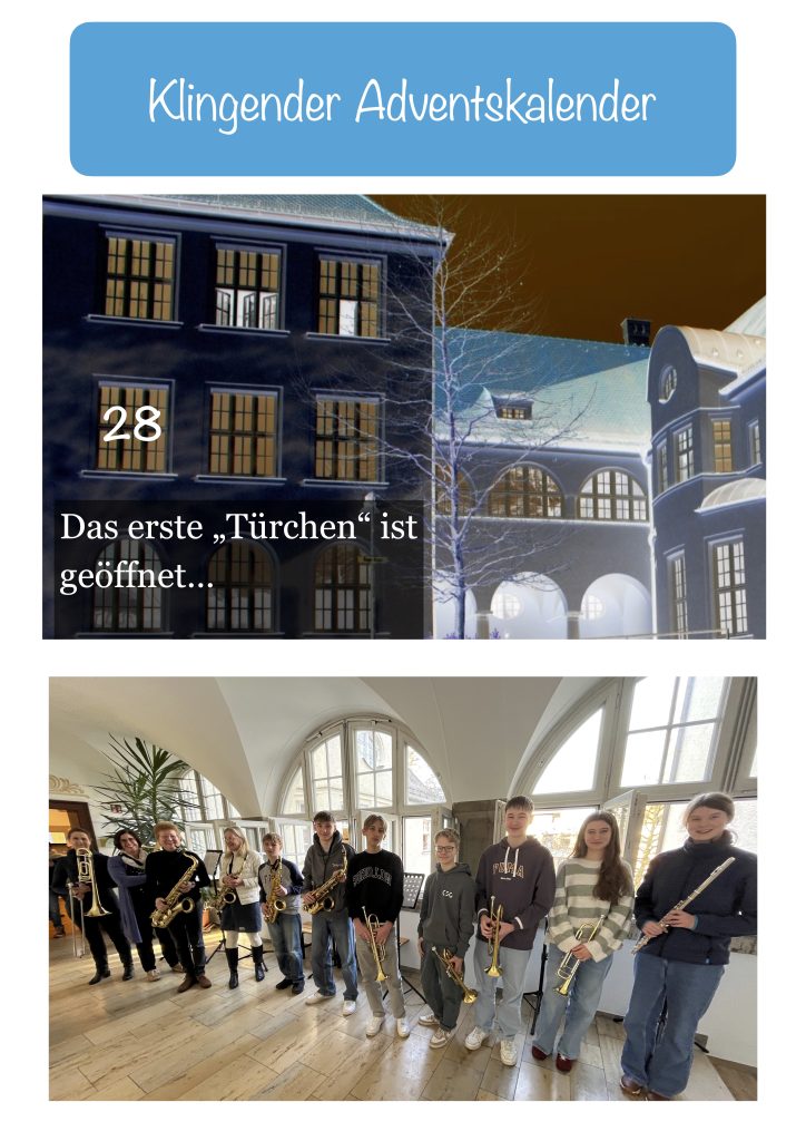 Ab dem 28.11. „öffnet“ die Bläsergruppe der Big Band unterstützt von musizierenden Kolleginnen immer freitags in der 1. Pause ein neues „musikalisches Türchen“. Zu hören sind die weihnachtlichen musikalischen Überraschungen im Pausenhof und es darf gerätselt werden, welches Türchen oder Fenster sich an den Terminen 28.11., 5.12. und 12.12. wohl öffnen wird.